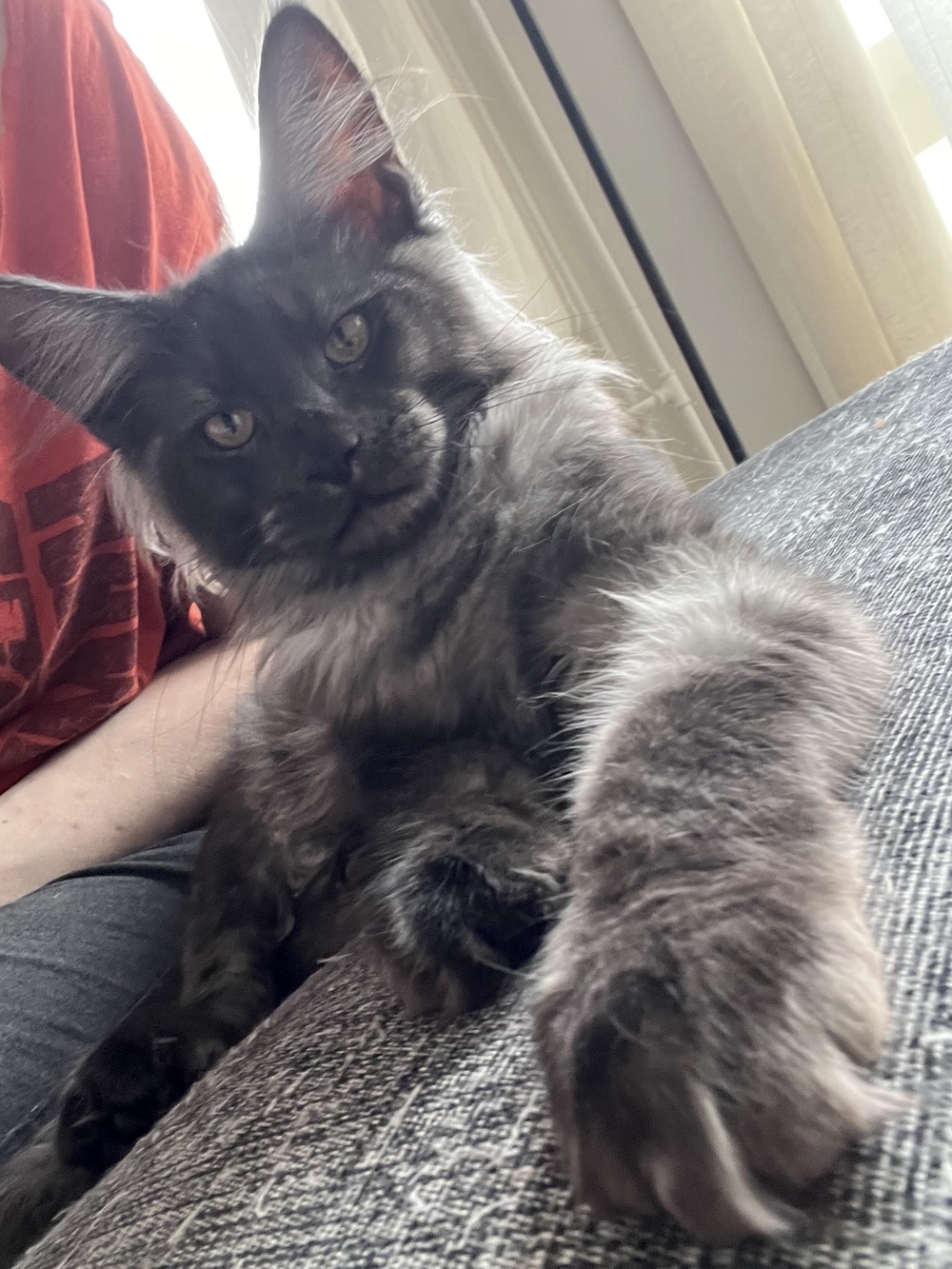 04:50 Kissanpentu hyppää rinnan päälle ja käpertyy siihen nukkumaan.
