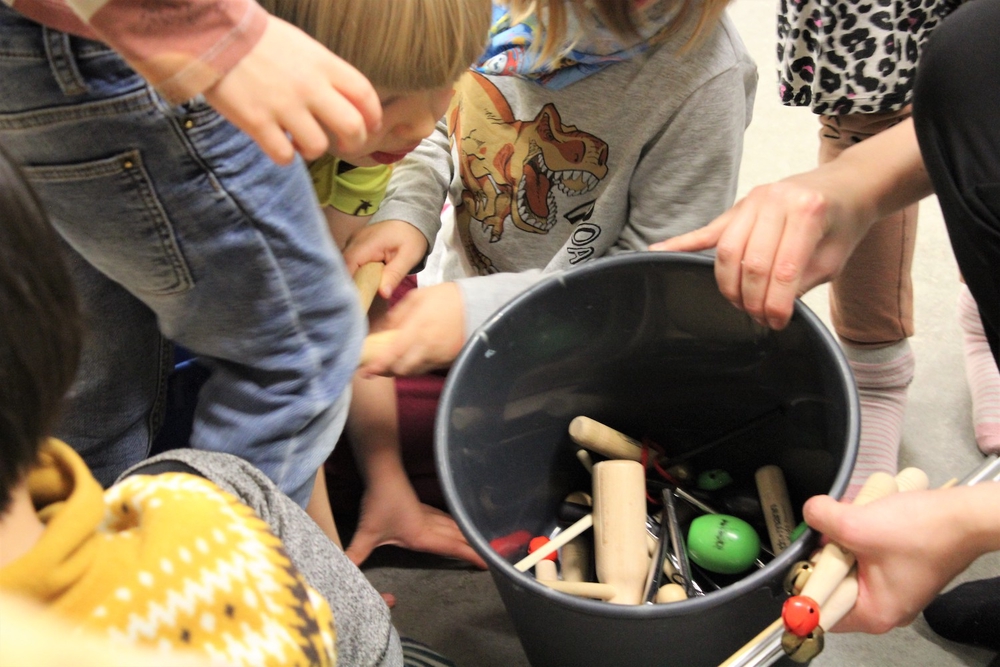 Parasta muskarissa on lapsemme mielestä soittaminen. Syksyn aikana bändiläiset ovat päässeet kokeilemaan monia oikeita soittimia, muun muassa kitaraa, ukulelea, pianoa, sähkörumpuja, sähköbassoa, marakasseja ja kapuloita. Myös oikeat mikrofonit ovat olleet lasten käytössä. Soittamisen lisäksi tunneilla myös kuunnellaan monipuolisesti erilaista musiikkia yhteisten leikkien lomassa.