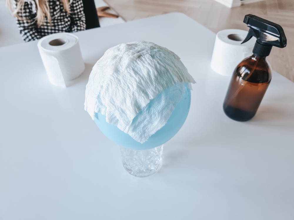 Aseta pallo esimerkiksi tyhjän lasin päälle ja aloita wc-paperipalojen asettelu pallon päälle.