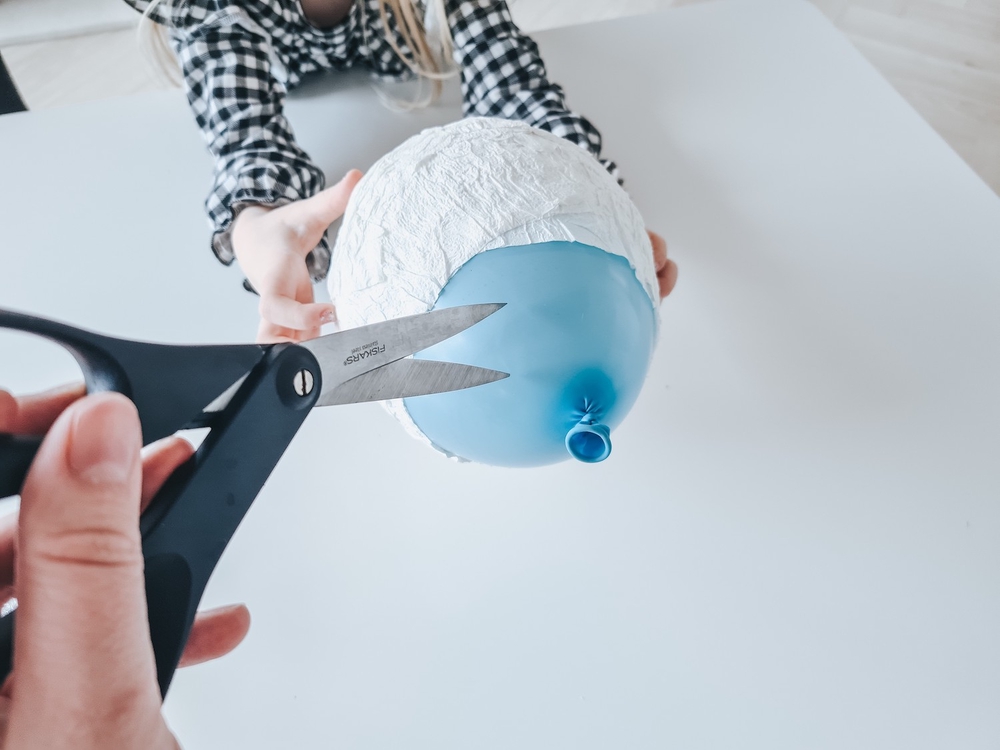- Kun paperi on kuivunut, poksauta pallo varovasti. Viimeistele työ leikkaamalla reuna siistiksi, esimerkiksi siksakkia.
