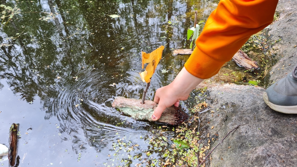 Mutsimedian tekijätiimiin kuuluva perhe suuntasi pienen koululaisen lomapäivänä lähiluontoon, valmisti muutamat kaarnalaivat ja meni lammelle kokeilemaan, miten ne pärjäävät tositoimissa.