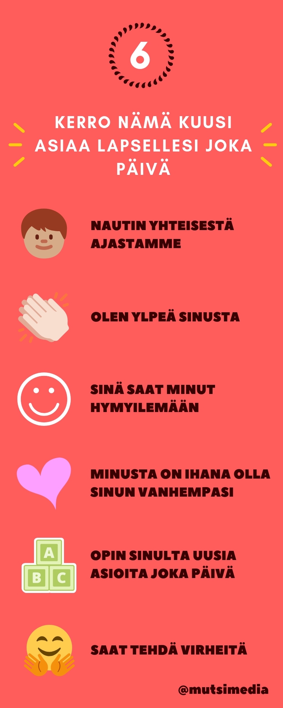 Kun vanhempana viestit johdonmukaisesti läsnäoloa, rakkautta ja luottamusta, lapsen hermosto rauhoittuu, oppimiskyky vahvistuu ja kyky säädellä tunteita kasvaa. Seuraavat kuusi viestiä ovat lyhyitä ja pieniä, mutta vaikutuksiltaan suuria. Niiden tarkoituksena ei ole täydellisyyden tavoittelu, vaan lempeä muistutus: kun sanat toistuvat arjessa, ne alkavat kantaa.