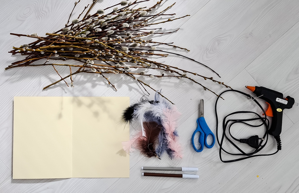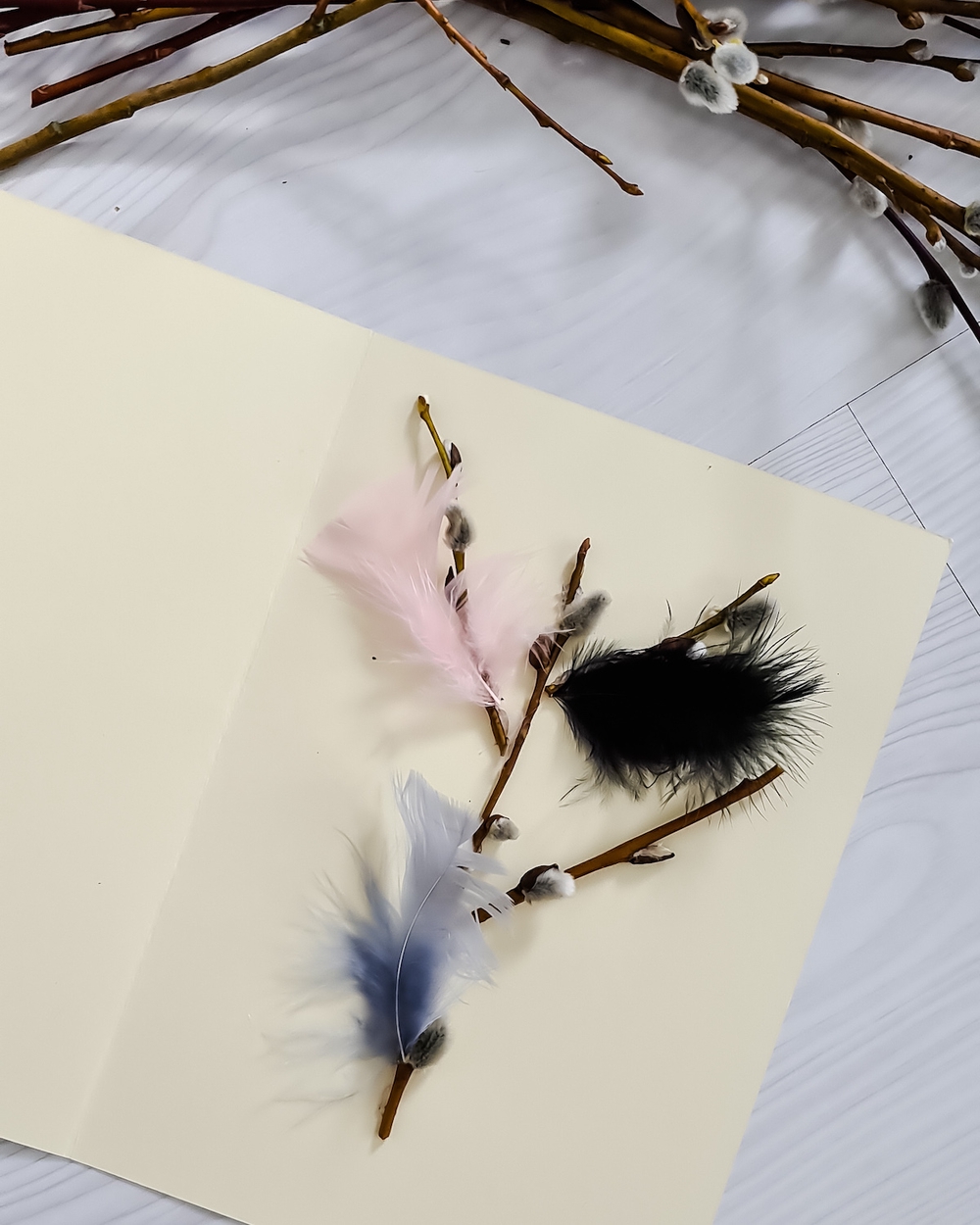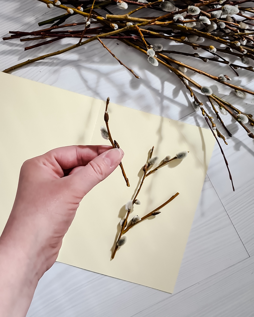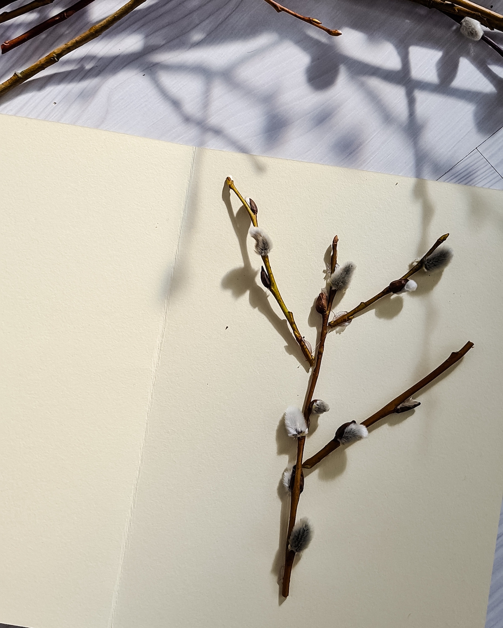 Kortit voi valmistaa juuri sinun kotoasi löytyvistä materiaaleista, eikä edes oikeiden pajunoksien käyttö ole välttämättä tarpeen. Varsinkin, jos joudut postittamaan kortit postilaatikkoon sujauttamisen sijaan, kannattaa ennemmin piirtää pajunkissat varsineen.
