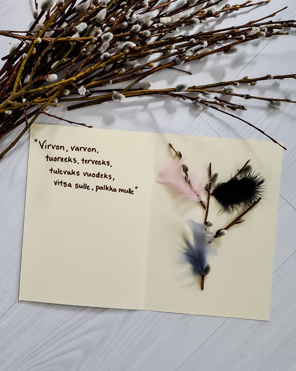 Virpomiskortti on kekseliäs ja kiva keino, jolla voit jakaa hyvää mieltä ja toivottaa mukavaa pääsiäisen aikaa ilman ihmiskontakteja. Saat korttien askartelusta myös mukavaa puuhaa lapsien kanssa kotoiluun. Kortti sopii mainiosti myös kauempana asuvien tuttavien ilahduttamiseen.
