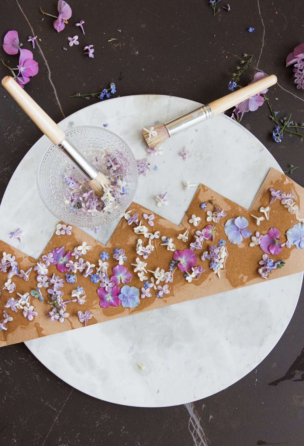 - Lisää sitten kulhoon kukkien terälehdet ja sekoita. Käytä kukkaliima lämpöisenä. Jos kukkaliima on liian jähmeää, voit lisätä tilkan kuumaa vettä.