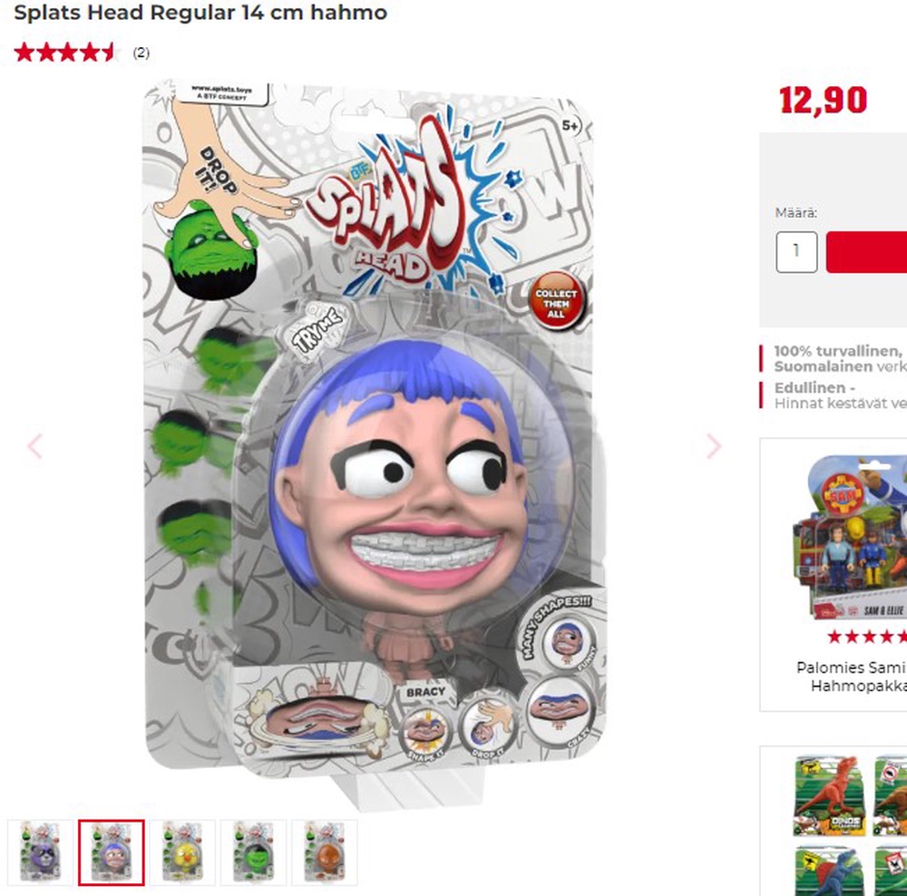 Viime vuonna esikouluikäinen esikoisemme näki televisiomainoksen Splats Head -hahmoista, jotka muuttavat muotoaan lattialle heitettäessä. Lapsi ihastui leluun kovasti ja sai kuin saikin yhden Splats Head -hahmoista myöhemmin lahjaksi sukulaisilta.