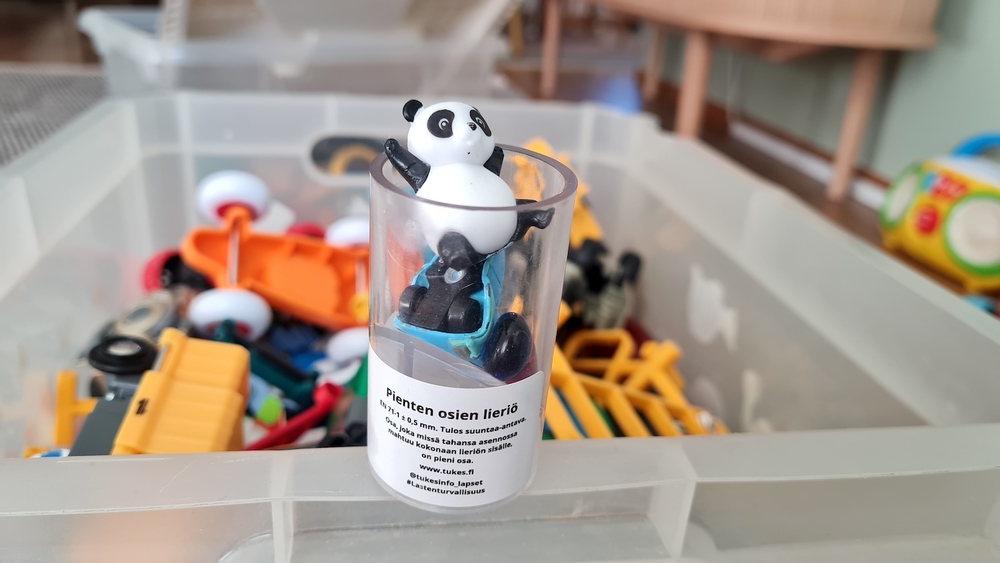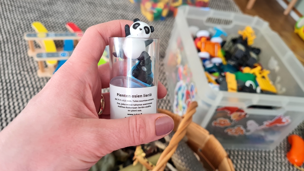 Näissä tilanteissa nappaan välillä pienten osien lieriön ja testaan, mahtuuko kappale sen sisälle. Jos mahtuu, siirrän kappaleen kuopuksen ulottumattomiin. Toki toinen vaihtoehto on, että kaikki epäilyttävän pienet osat siirretään suoraan piiloon vauvalta tai taaperolta.