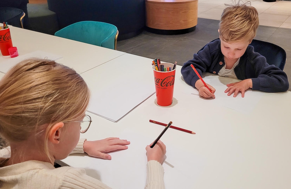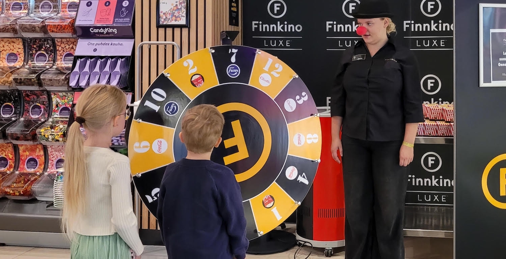 Punaiseen pellenenään ja miimikkokäsineisiin pukeutunut henkilökunta viittoi meitä peremmälle ja kutsui osallistumaan lapsille järjestettyihin aktiviteetteihin. Lapset voittivat onnenpyörästä suklaalevyn ja piirustuspisteellä Pelle Hermannin muotokuvia taiteilemalla he ansaitsivat ilmaiset popparit leffaherkuiksi. Tämä, tietenkin, lisäsi innostusta entisestään ja nosti odottavan fiiliksen kattoon.