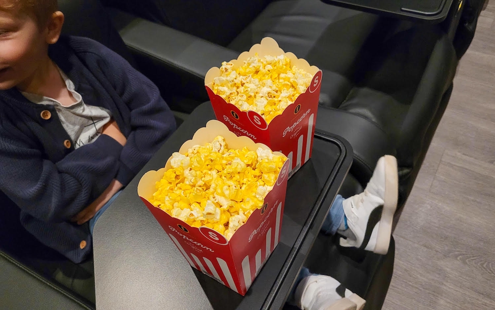 Popcornkulhot käsissään lapset pomppivat kohti elokuvasalia ja siellä oli vastassa uusi yllätys, myös allekirjoittaneelle. Emme olleet ennen käyneet Finnkinon Luxe -teattereissa, joissa on rutkasti tilaa ja jokaiselle omat, säädettävät nojatuolit tarjottimineen. Miten ihanaa, että leffateattereissa on otettu harppaus nykyaikaan, eikä enää tarvitse istua salissa kuin sillit purkissa, korokkeita lapsille etsien tai toisten ihmisten päiden takaa valkokankaalle kurkkien.