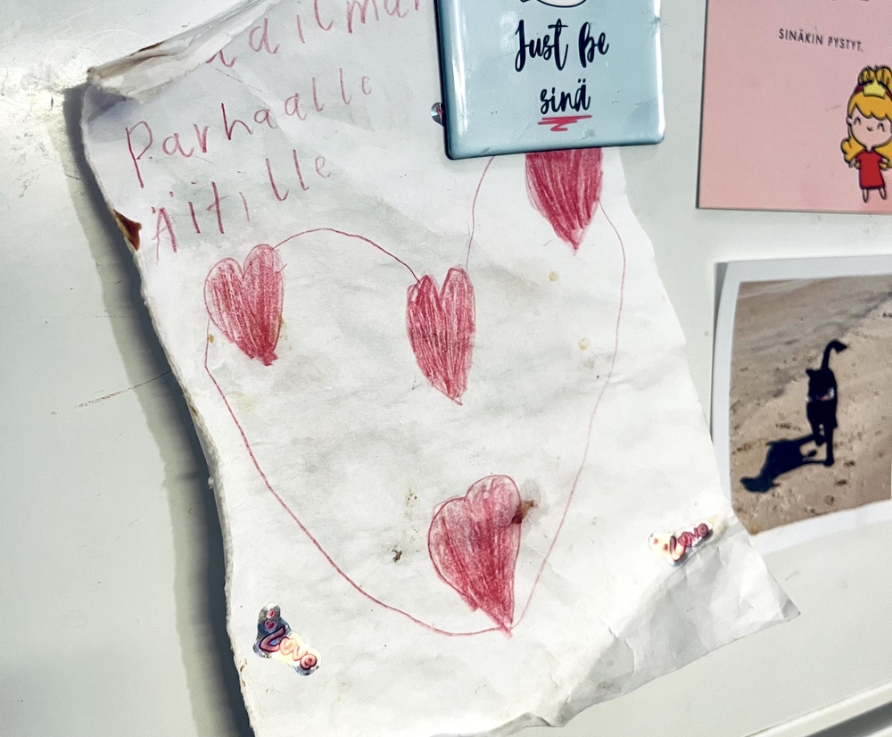 Mutsi tekee aina samoja ruokia, ei koskaan mitään erityistä. Eikä se pese pyykkiä niin että kaikki ois aina kaapissa valmiina. Se huomauttelee astioista, mitä j o s k u s jää jonnekin pinoihin lojumaan ja on töissä myöhään eikä aina ehdi kuskaamaan. Kai sitä joskus on myös vähän ikävä.