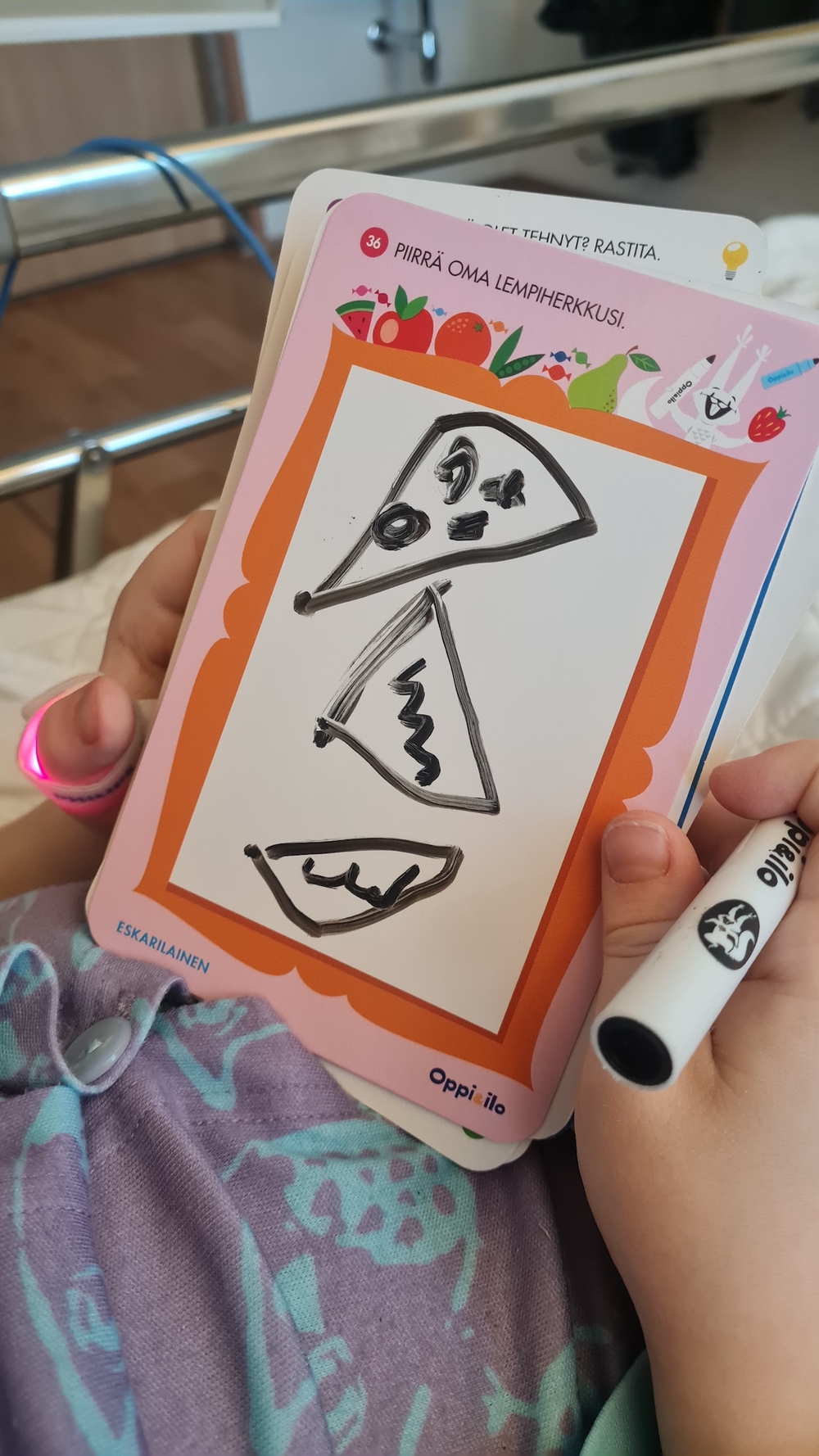 Tilannetta helpotti, kun henkilökunta toi leluja. He kyselivät, millaisista leluista lapsemme pitää ja näin meille järjestyi mieluista tekemistä. Flunssaoireiden hiivuttua saimme jopa Nintendon huoneeseen. Käytössämme oli myös sairaalan tabletti, ja katsoimme muutamia elokuvia Disney+-palvelusta.