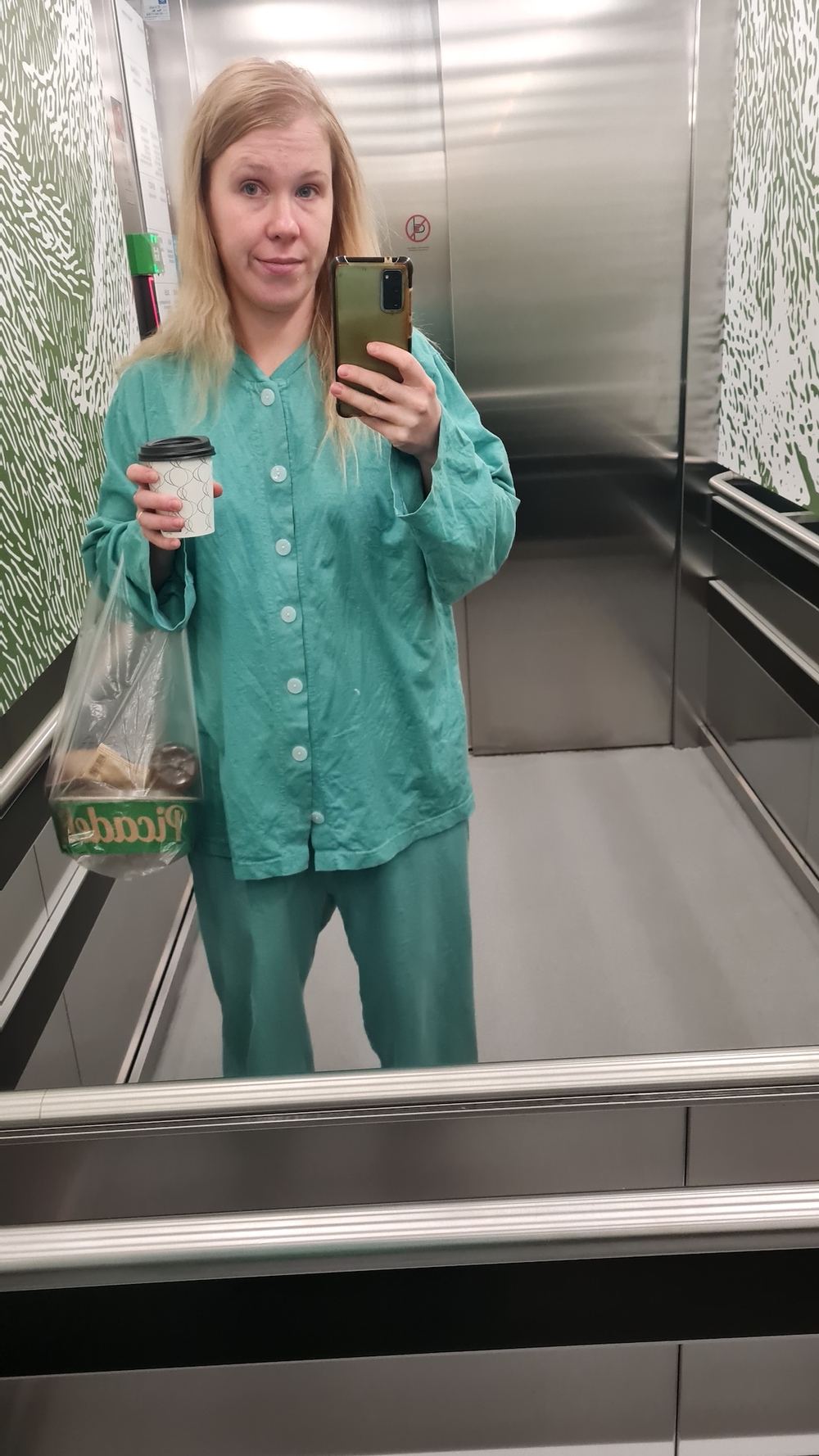 Mieleeni jäi eräs erityisen lempeä työntekijä, joka tarjoutui olemaan lapsemme kanssa sillä välin, jos haluaisin käydä esimerkiksi sairaalan kahvilassa itsekseni. Tartuin tilaisuuteen, vaelsin väsyneenä ja meikittömänä kahvilaan, maksoin ostokseni ja hississä tulin napanneeksi alla olevan peiliselfien.