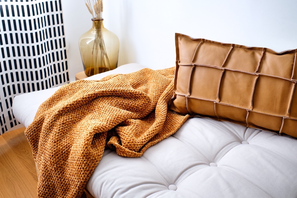 Päiväpetiä kaunistamaan löysin tyylikkään nahkatyynyn suomalaisen Miiko Designin valikoimasta. Ruskeasävyinen Väre-tyyny sopii kivasti daybedin päälle ja antaa sisustukseen rouheutta sekä lämpöä. Okranvärinen chenille-torkkupeite on H&M Homen mallistosta.