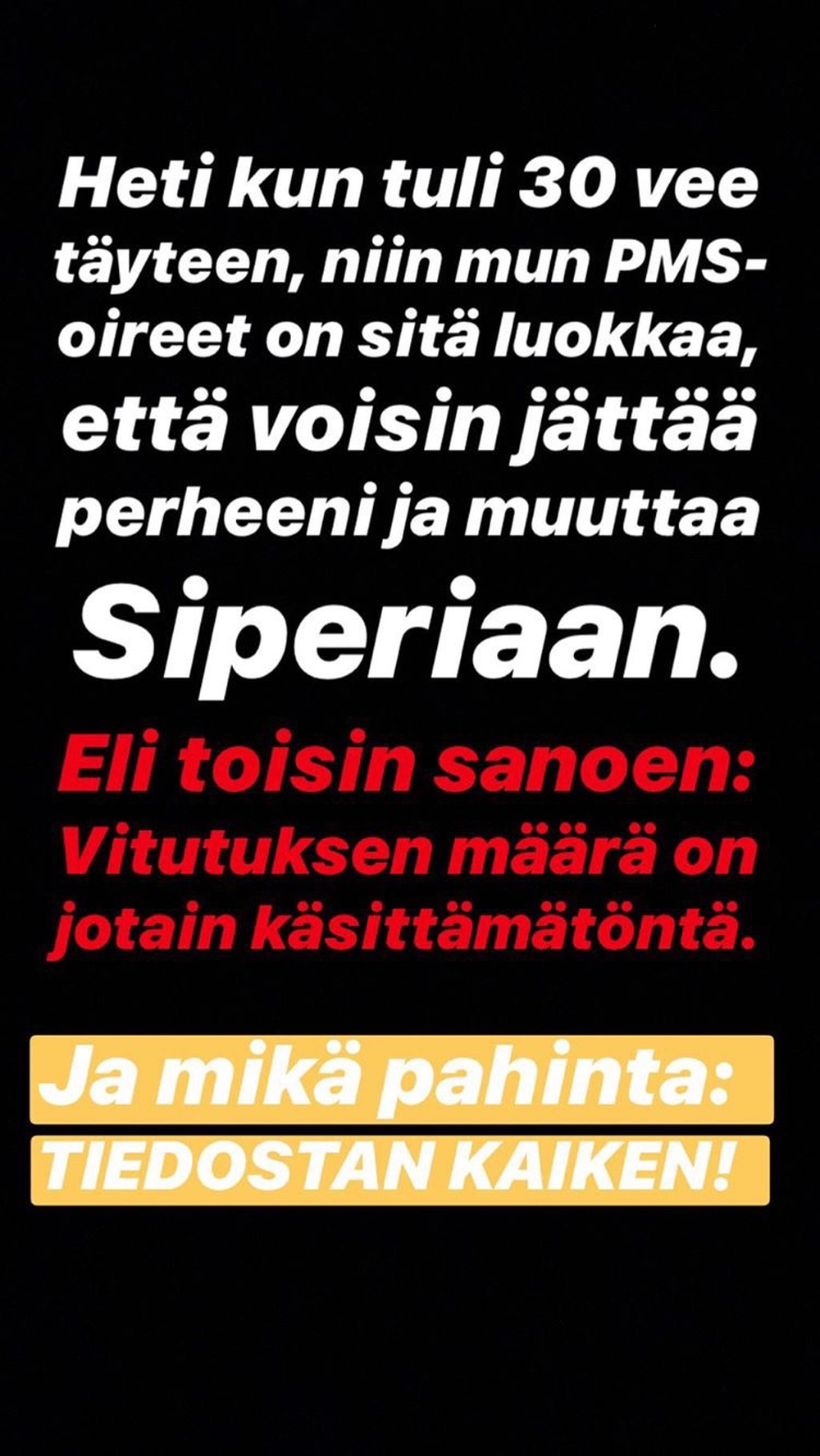 Tämän postattuani aloin saada yksityisviestejä, joissa kerrottiin samoista oireista. Eräs nainen kirjoitti, että hänen stressinsietokykynsä romahtaa, mikä taas aiheuttaa illuusion, ettei kyseinen henkilö selviä töistä tai arjesta. Hän on selittänyt lapsilleen, että kerran kuukaudessa äidin olo on kipeä ja hermot kireällä. Lapset kuulemma ymmärtävät.