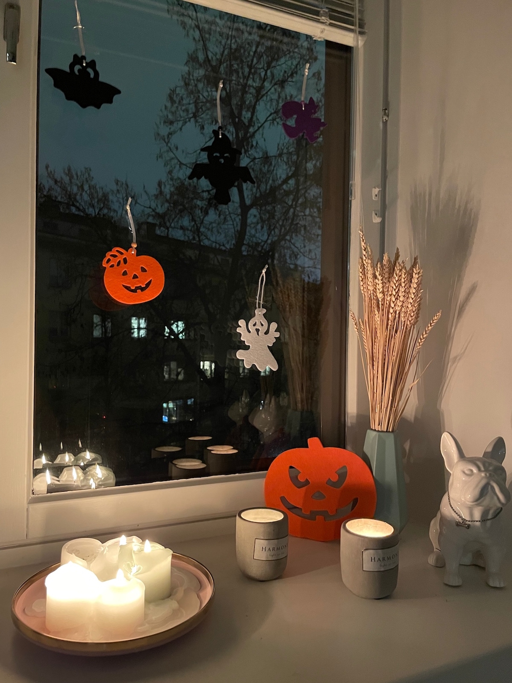 Olen kauan sitten hankkinut halloween-huopakoristeet. Näitä me laitamme seinille, ikkunoille, oviin, ja saadaan helposti luotua hyvä tunnelma. Kynttilät viereen palamaan ja muutama heinä, niin tulee kunnon syksyinen tunnelma.