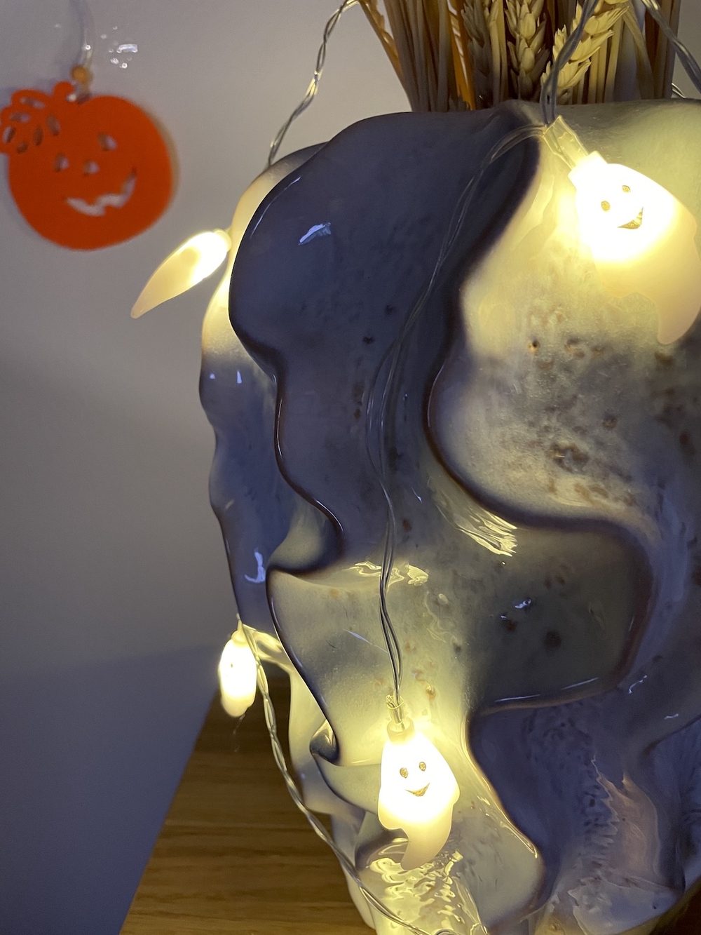 Viime vuonna olen Sinsaysta ostanut (4 €) tällaiset patterilla toimivat kummitusvalot. Helppo laittaa mihin vain, kuten kuvassa maljakon ympärille.