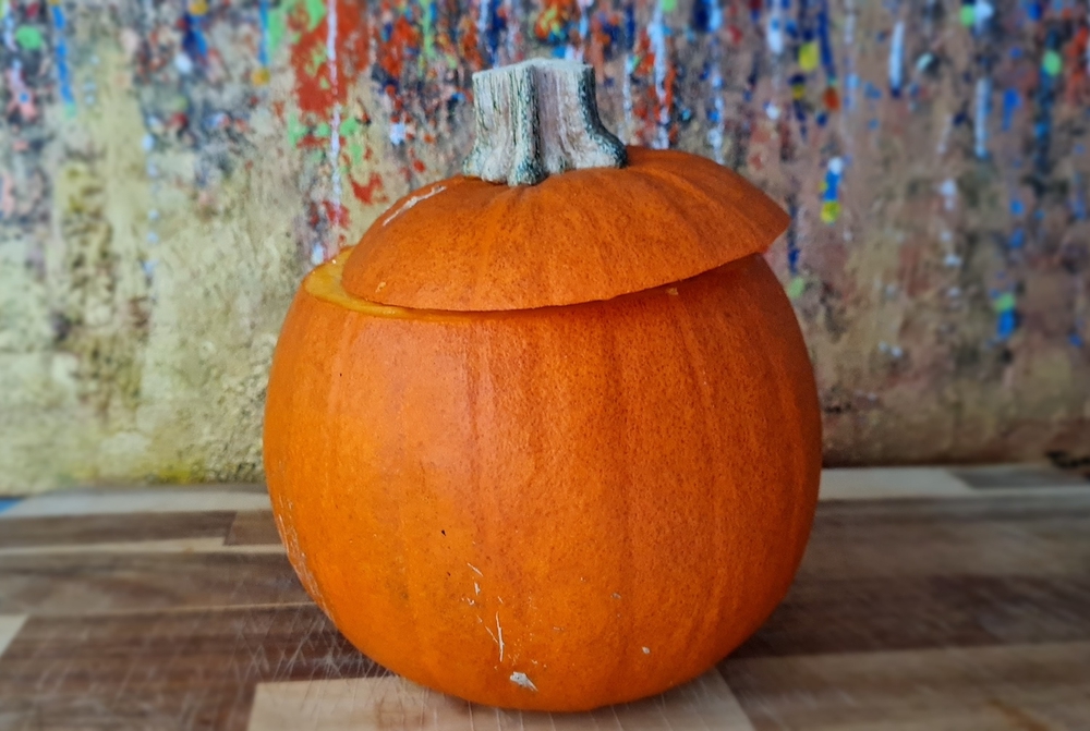 Tee yllä olevasta ohjeesta kohdat 1 ja 2, minkä jälkeen aseta sisältä koverrettu kurpitsa sivuttain tukevalle alustalle.