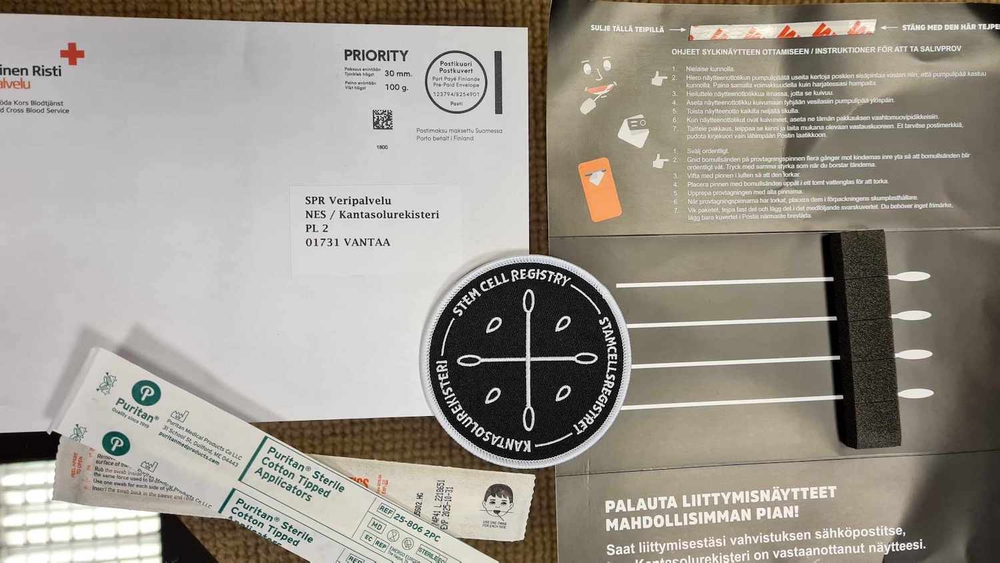 Esteitä liittymiselleni ei ilmennyt, ja muutamia päiviä myöhemmin postiluukusta tipahti suurehko kirjekuori. Se sisälsi ohjeet ja tarvikkeet sylkinäytteen ottamista varten, Kantasolurekisterin merkin ja kuoren, jossa näytteet palautetaan postitse Veripalvelulle. Postimaksu on maksettu valmiiksi, ja Kantasolurekisteriin liittyminen on mielestäni tehty todella helpoksi kaikin puolin.