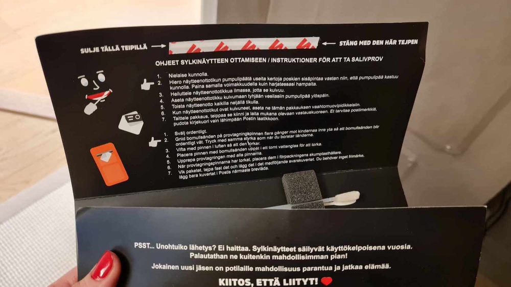 Otin sylkinäytteet aamulla toimistopäivän alkajaisiksi, ja työpäivän päättyessä siirsin kuivuneet näytepuikot ohjeiden mukaisesti palautuskuoreen. Sitten lähdin kohti kotia – postilaatikon kautta tietenkin.