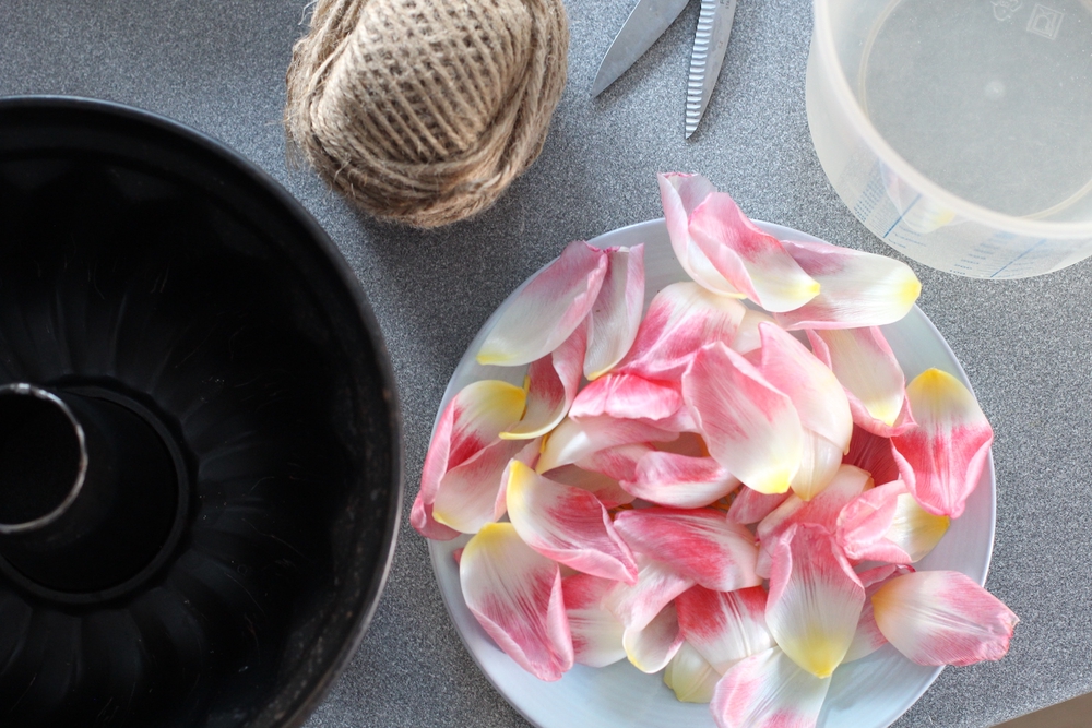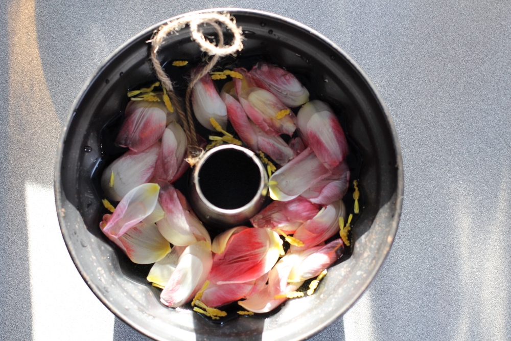 - Kaada vettä kuivakakkuvuokaan ja laita terälehdet ja heteet sekaan.