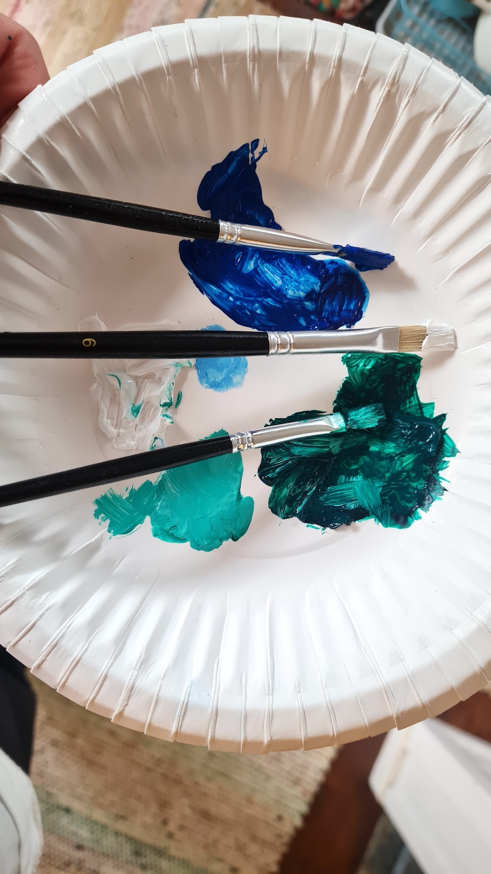Suojasin maalauspisteeni sanomalehdellä, ja laitoin akryylivärejä kertakäyttölautaselle. Värien ohentamista varten kaadoin astiaan vettä, ja sitten kaikki oli valmista kiven maalausta varten. Jos maalaat kiviä lapsen kanssa, kannattaa ainakin hänen pukeutua vaatteisiin, jotka saavat sotkeutua.