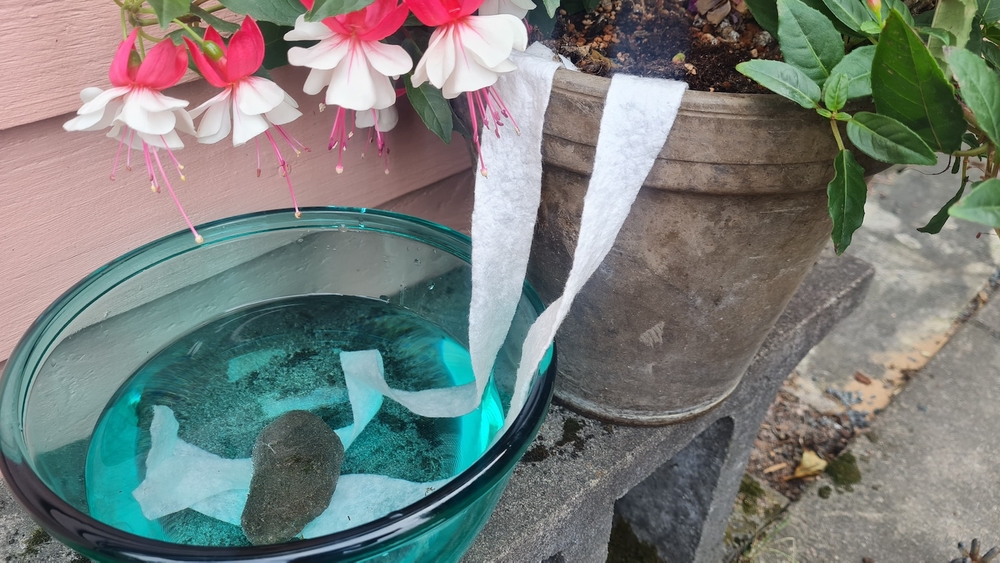 Laita kulhoon tai muuhun syvään astiaan runsaasti vettä. Aseta vesiastia ruukun lähelle niin, että astia on ruukkua alempana. Kastele tekstiilisuikale ja aseta toinen pää veteen ja toinen multaan parin sentin syvyyteen (vaihtoehtoisesti voit laittaa nauhan ruukkuun pohjareiän kautta.) Tiivistä multa huolellisesti tekstiilin ympäriltä. Laita vesiastiaan tekstiilin päälle jokin paino. Vesi imetyy hiljalleen multaan nauhan kautta.