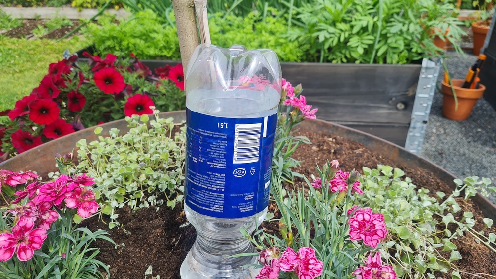 Tee virvoitusjuomapullon korkkiin muutama pieni reikä. Täytä pullo vedellä, tee multaan lähelle kasvin tyveä riittävän syvä kolo ja aseta pullo siihen korkki edellä pystysuorassa asennossa. Tiivistä multa huolellisesti pullon ympäriltä.