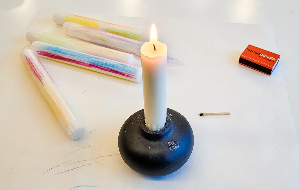 Nosta värittämäsi kynttilä palavan kynttilän yläpuolelle ja liikuttele sitä liekin lähellä. Älä anna liekin kuitenkaan koskea pintaa, koska muuten se mustuu. Liekin lämmittäessä pintaa, värit leviävät pyörteiksi ja muodostavat kauniita kuvioita. Kokeile miten erilaiset liikkeet muuttavat lopputulosta. Jatka niin kauan, kunnes olet tyytyväinen lopputulokseen.