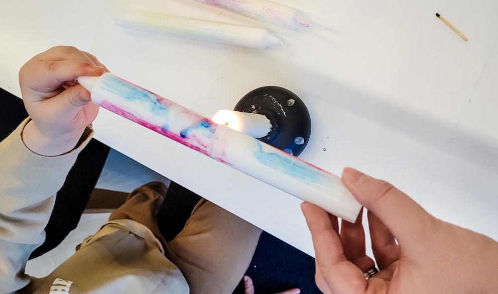 Huom! Voit tehdä tämän vaiheen joko itse, antaa isomman lapsen tehdä omin käsin tai tehdä lapsen kanssa yhdessä niin, että lapsi pitää kiinni kynttilän toisesta päästä ja aikuinen toisesta päästä.