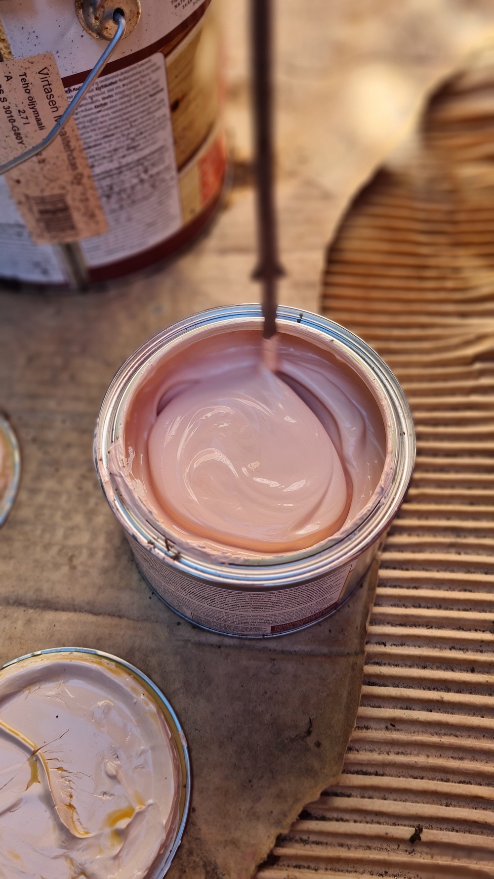 Palstallamme oli kesällä toinen isompi maalausprojekti, josta meille oli jäänyt useampia eri sävyisiä ulkomaaleja. Maalit löytyivät minulta näin ollen omasta takaa, joten maalikaupoille ei ollut tarvetta lähteä.