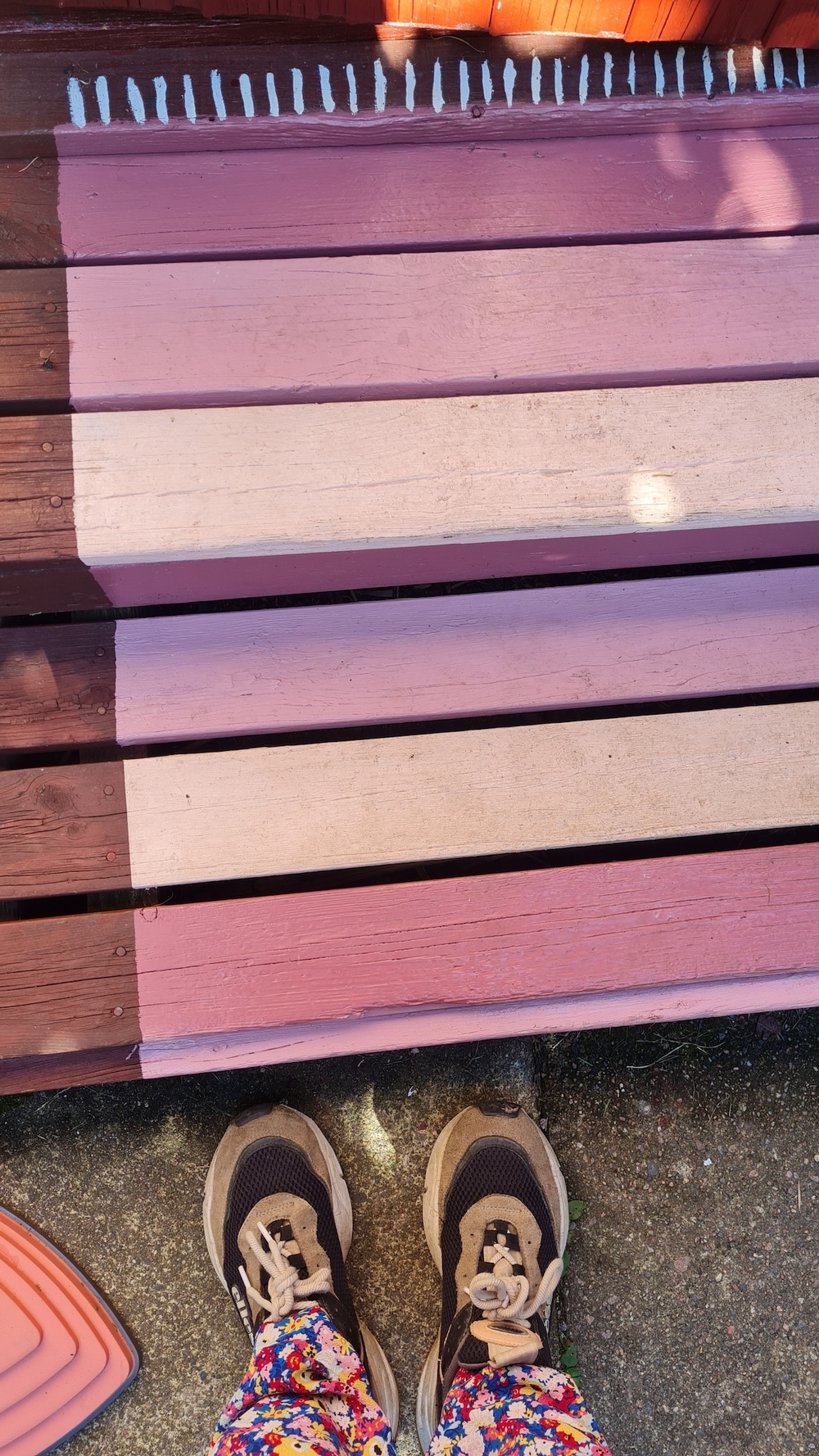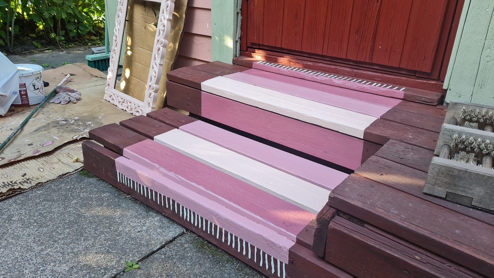 Vietettyämme ensin yhdessä aikaa kuulumisia vaihdellen ja erityisesti herne- ja vadelmasatoa nautiskellen, siirryimme viimein itse projektin pariin. Meillä meni hetki jos toinenkin jo pelkästään maalipurkkien avaamiseen tasareunaisen ruuvimeisselin avulla, minkä jälkeen sekoittelimme maaleja saadaksemme aikaan halutut värisävyt. Maton raitoihin valikoitui kolme roosan sävyä, ja hapsut päätimme maalata valkoisiksi. Samalla suunnittelimme, miten käytännössä maalaamme maton portaille.