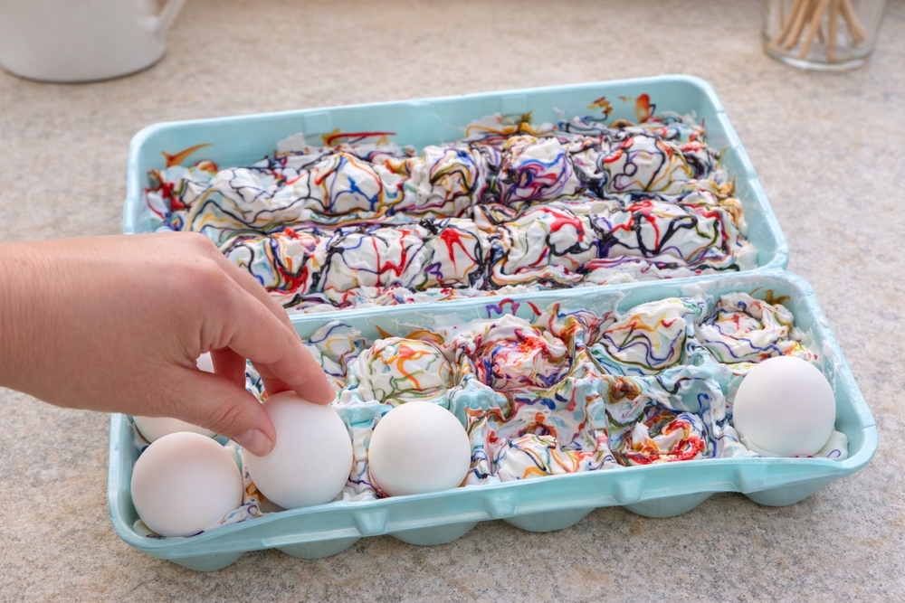 Anna munien levätä hetki, jotta väri ehtii tarttua kunnolla. Lopuksi pyyhi vaahto pois paperilla tai huuhtele kevyesti. Kun muna kuivuu, marmoroitu pinta paljastuu.