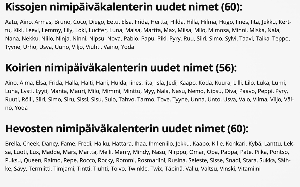 Suomessa lemmikkien nimipäiviä vietetään jatkossa entistä monipuolisemmin, kun Helsingin yliopiston almanakkapalvelu on uudistanut nimipäiväkalenterit kissoille, koirille ja hevosille.