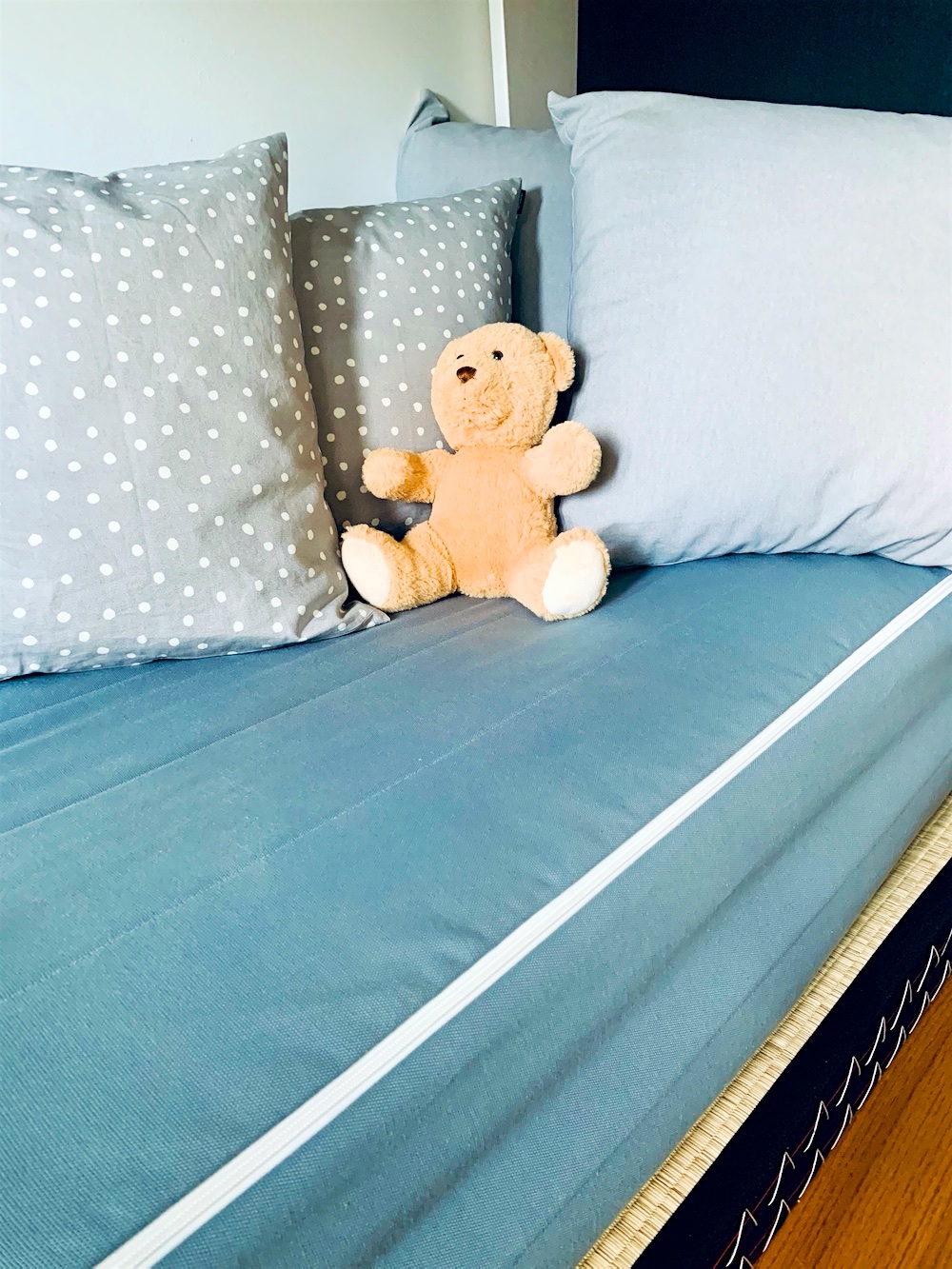 Löysin kuitenkin täydellisen ratkaisun sänkyyn: Beditin vetoketjullinen Zipit-päiväpeitto. Mikä parasta lapsi pystyy itse petaamaan oman sänkynsä aina aamuisin herättyään. Päiväpeitto pysyy myös hyvin paikoillaan vetoketjun ansiosta päivän leikkien aikana.
