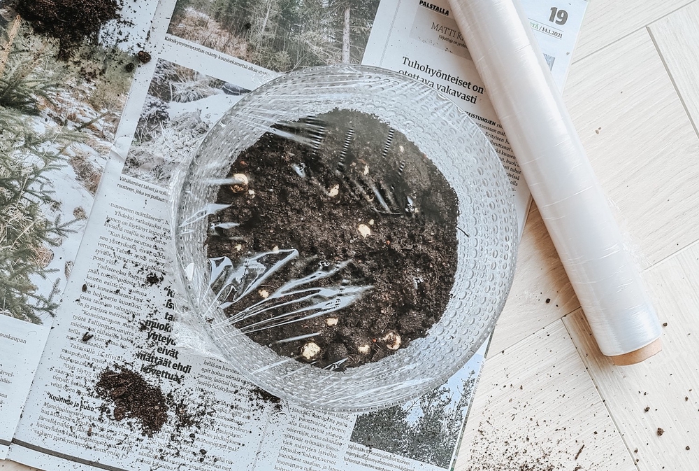- Täytä kulhon pohjalle muutaman sentin paksuinen kerros multaa. Tiputa liotetut herneet tasaisesti alueelle.