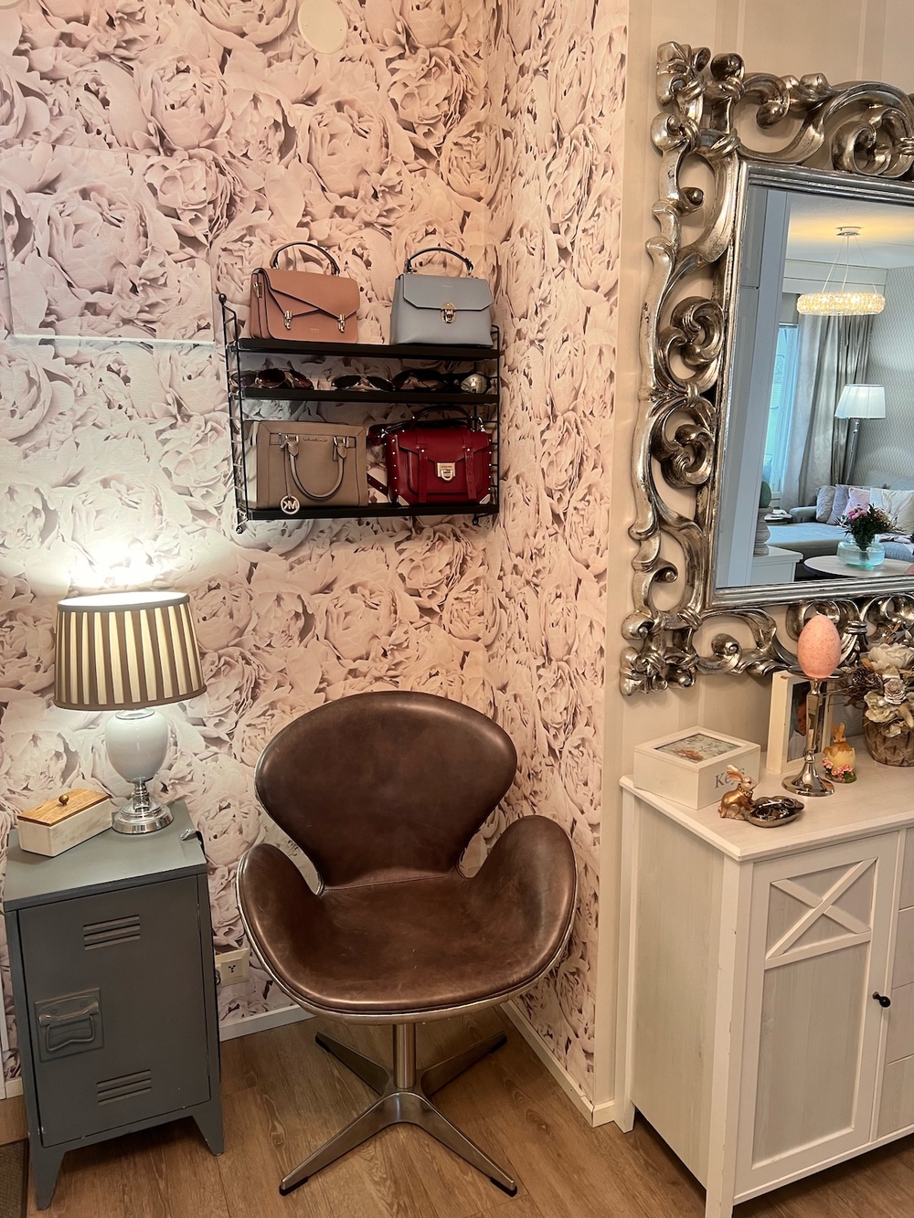 Sähkökaapin tuunaus tuli Janet Grundströmille ajankohtaiseksi, kun hän halusi kotinsa eteiseen kauniin aulan. Tilasta poistettiin siivouskaappi, ja sähkökaappi jäi seinälle. Pian Janet löysi sisustusliikkeestä mieleisensä tuolin ja halusi siihen kontrastiksi hempeän tapetin.