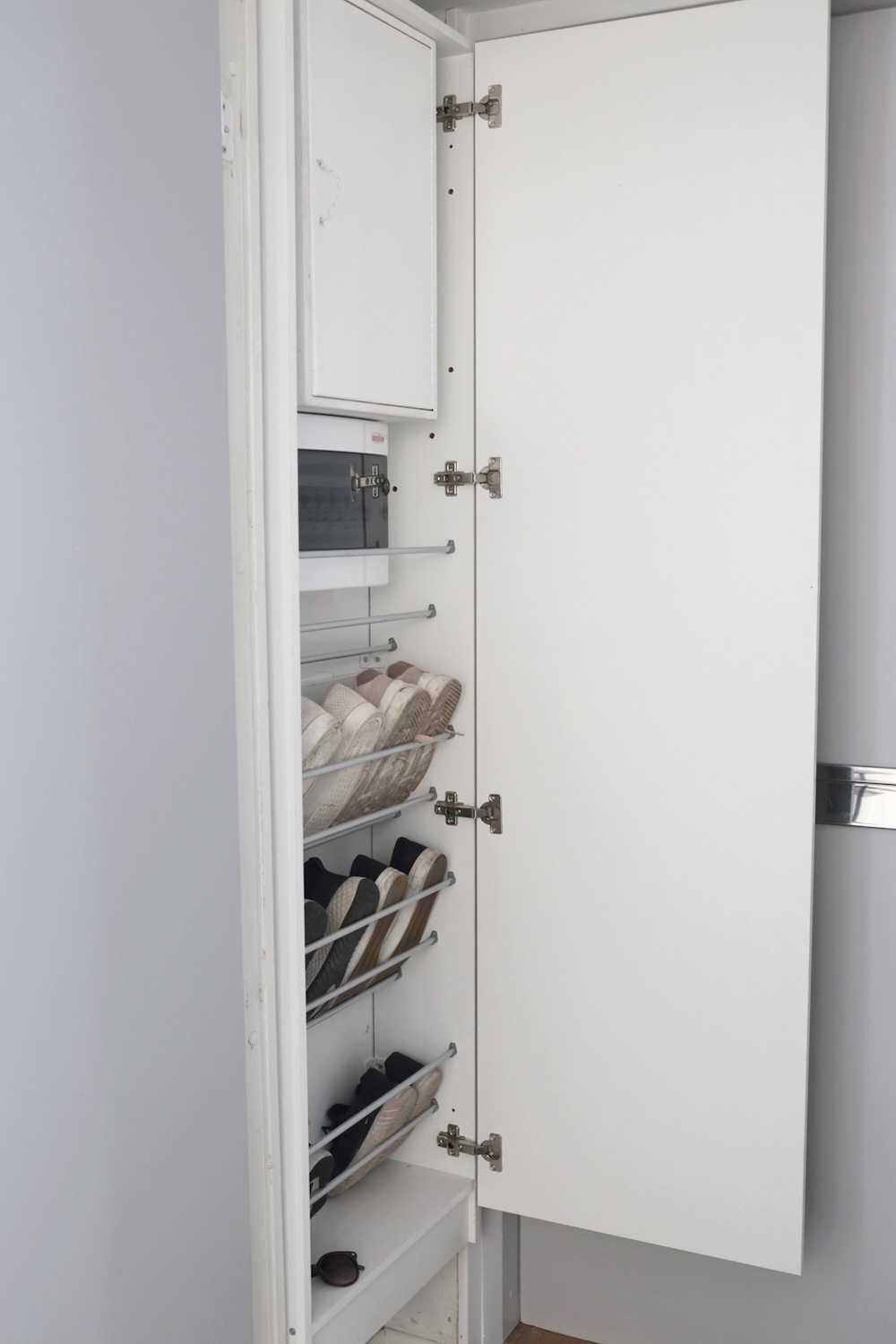 Vilja alkoi pohtimaan, voisiko sekä kenkien säilytysongelman että sähkökaappien piilottamisen ratkaista yhdellä ratkaisulla. Kahlattuaan nettiä läpi päivä päivää, Vilja löysi erityisen kapeaan tilaan sopivan kenkäkaapin. Sen asentaminen tilaan vaati luovuutta, mutta onnistui lopulta.