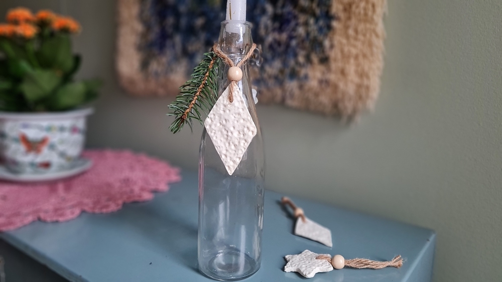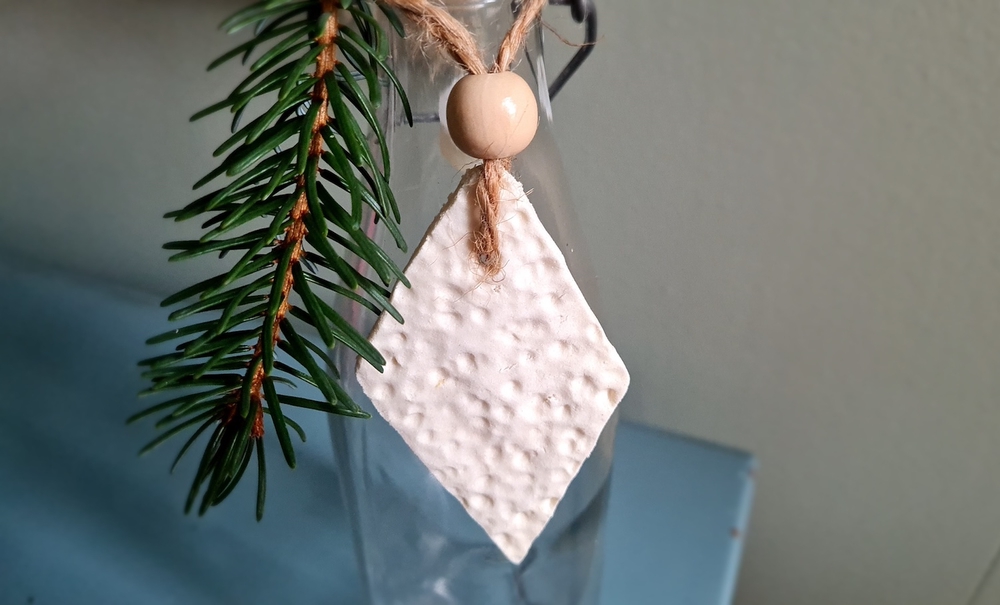 Painokuvioi taikinaa esimerkiksi pitsiliinalla, luonnonlehdillä tai leimasimilla saadaksesi kauniin tekstuurin. Tällaisia koristelaattoja voi käyttää esimerkiksi seinäkoristeina tai voit tehdä pieniä nimikylttejä esimerkiksi juhliin vieraiden istumapaikoille.