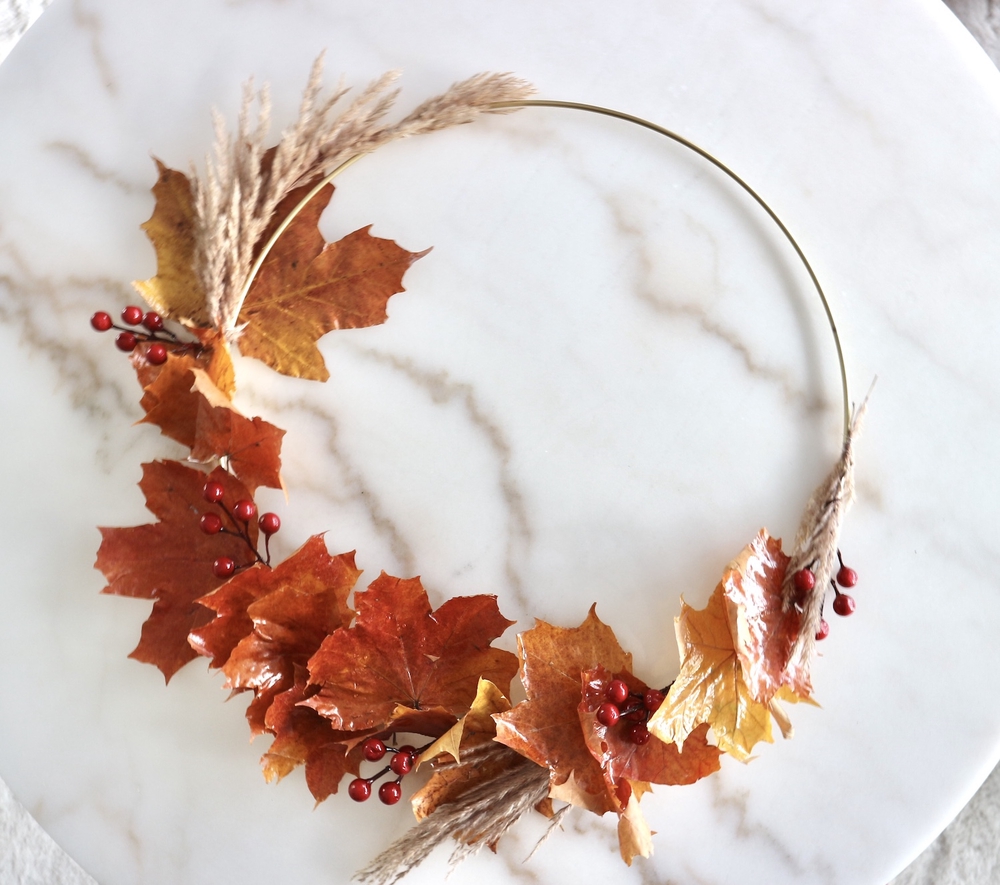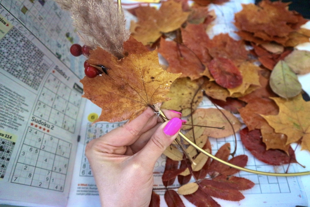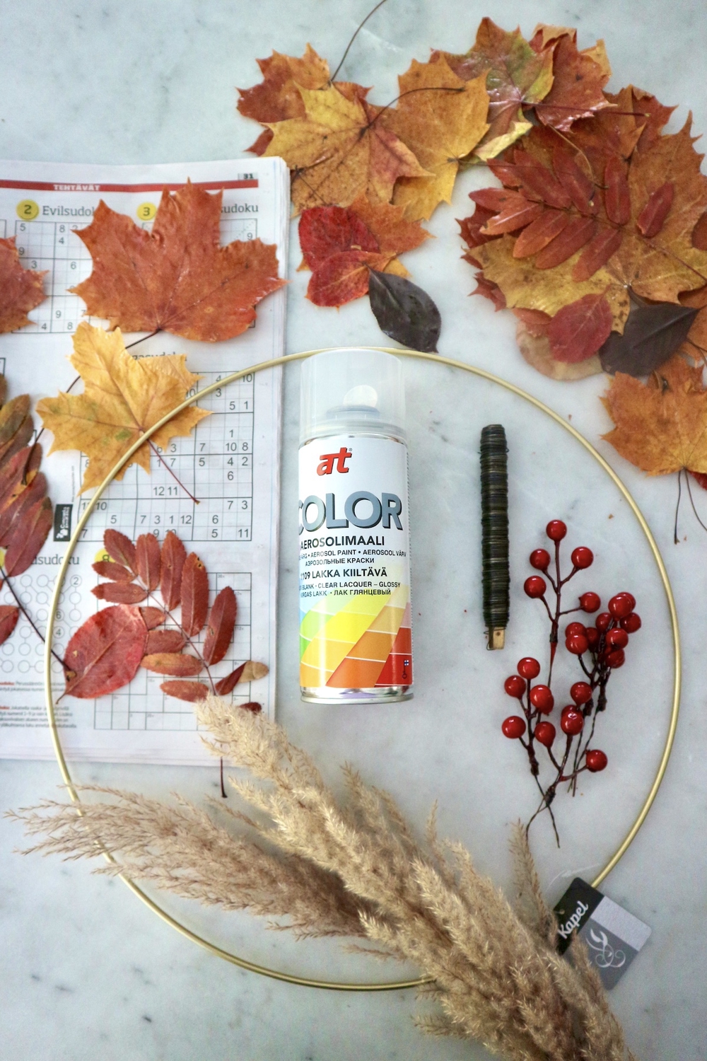Tämän kranssin materiaalikustannukset eivät päätä huimaa, sillä suuren osan poimit jokahenkilönoikeuksilla lähimetsästä ilmaiseksi. Spreijaaminen läpinäkyvällä lakalla tekee lehdistä kestävämmät ja auttaa säilyttämään värit, joten kranssi on pitkäaikainen ilo.