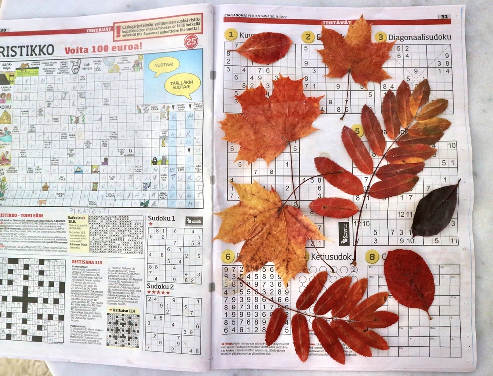 1. Kerää ulkoa kasa tuoreita, värikkäitä lehtiä ja asettele ne sanomalehtiarkkien päälle niin, että kaikki (puun)lehdet mahtuvat arkkien päälle kokonaan. Voit laittaa useita sanomalehtiaukeamia päällekkäin.