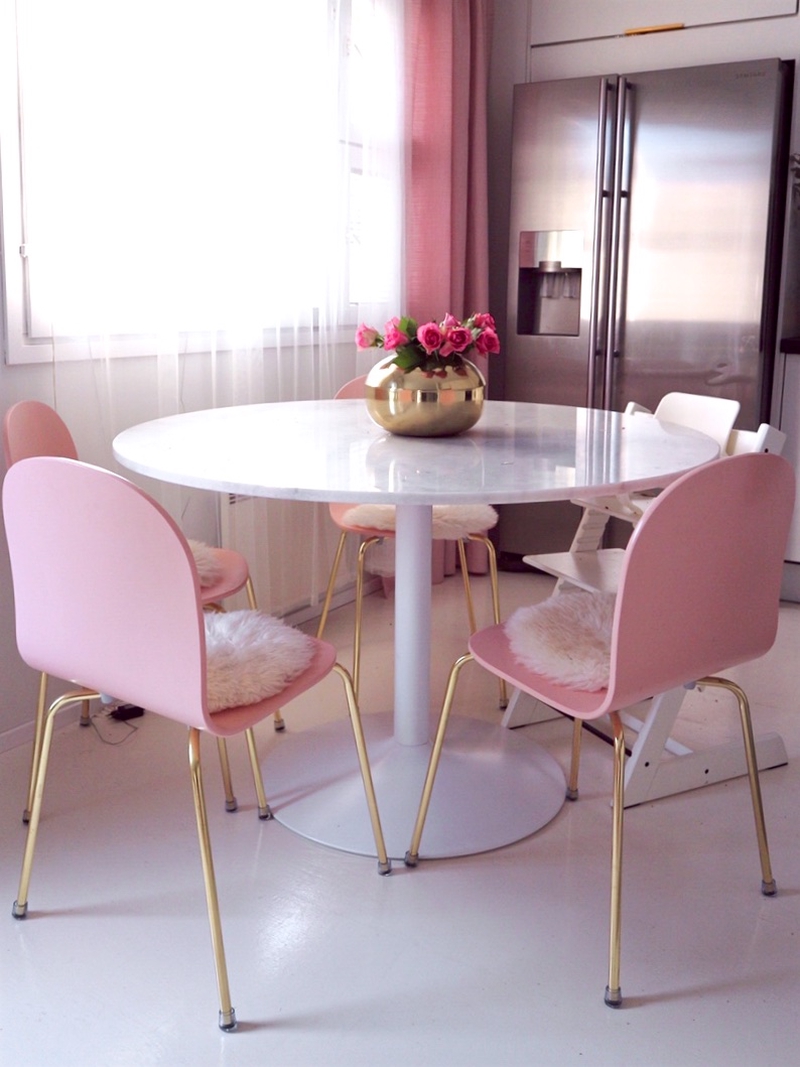 Tästä huolimatta päädyimme uuden ruokapöydän valinnassa vaaleaan marmoriin pöytälevyn materiaalina. Täydellinen yksilö löytyi Kodin1:stä, jossa pöytävalikoimaa olikin jokaiseen makuun.