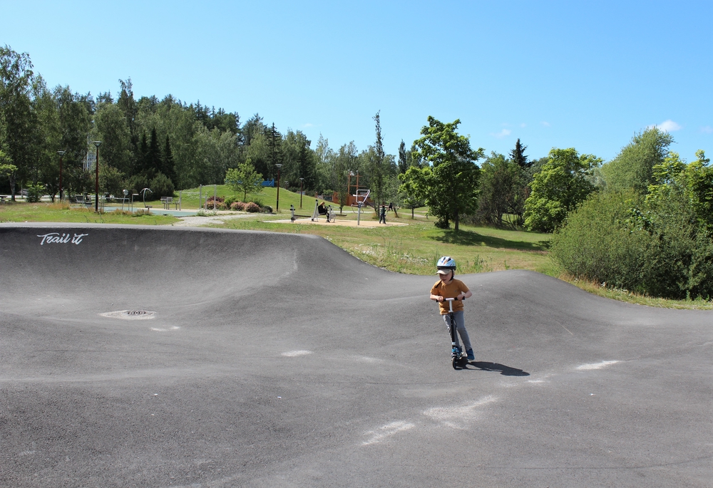 Skeittipuisto oli scootilla liikkeellä olleen lapsemme suosikkiaktiviteetti koko Uudenkaupungin lomallamme. Hän pyyhälsi onnessaan pitkällä pumptrack-radalla, joka kulki tunnelmallisesti osittain puiden lomassa. Paikalla oli jonkin verran muita scoottaajia ja skeittaajia, mutta iloksemme suuressa puistossa sai kuitenkin potkutella ilman ruuhkaa.