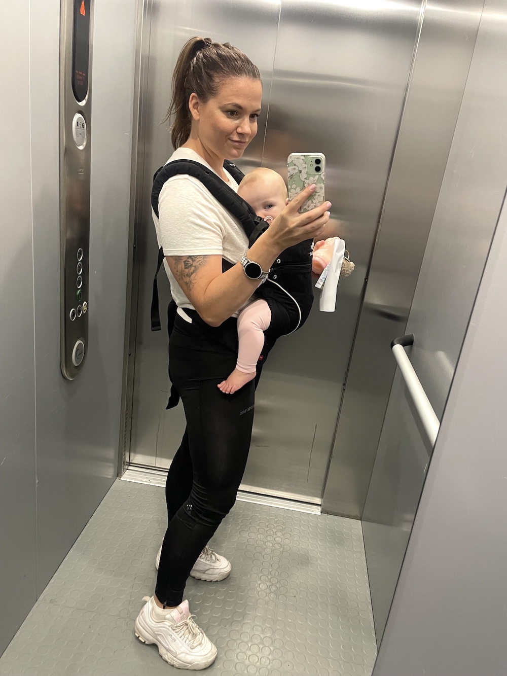 T-paita ja legginsit. Yksinkertaisen hyvä. Tämä asu on oikein hyvä myös lapsen kantamiseen. Kesällä voit vaihtaa shortsit tilalle.