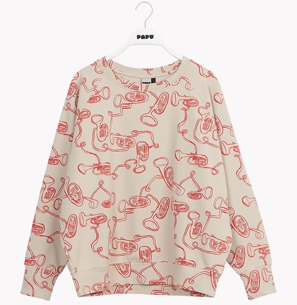 Papu. Lumoavaa torvensoittoa! MAXI-collegepaitaa koristavat koukeroiset instrumentit. 99e.
