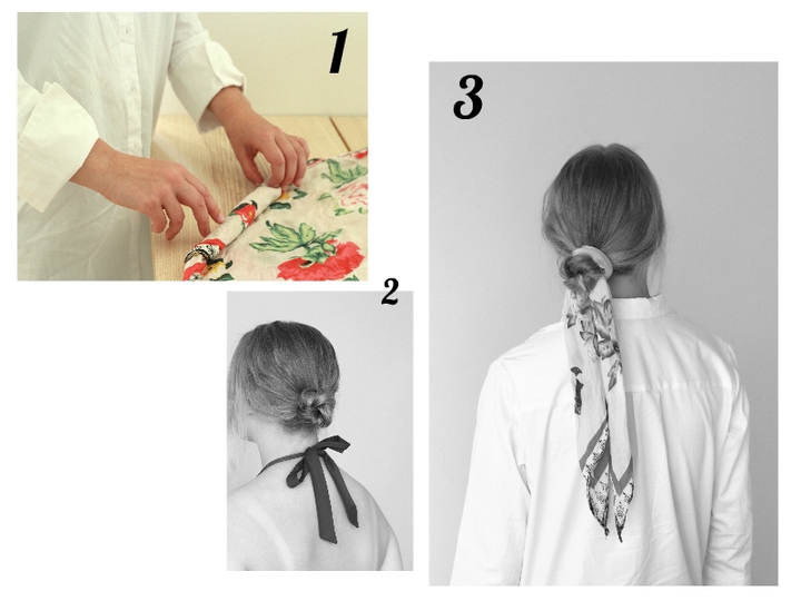 Tarvitset: huivi (silkkinen tai bandana), ponnari & hiuslakkaa