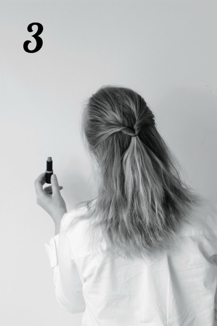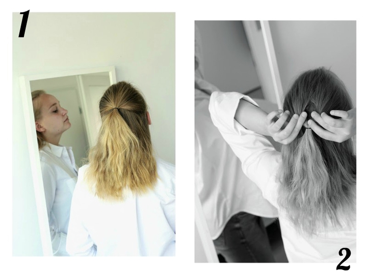 - Jaa tukka kahteen osaan. Pyöritä osiot lomittain ja kiepauta rennolle nutturalle ponnaria apuna käyttäen.