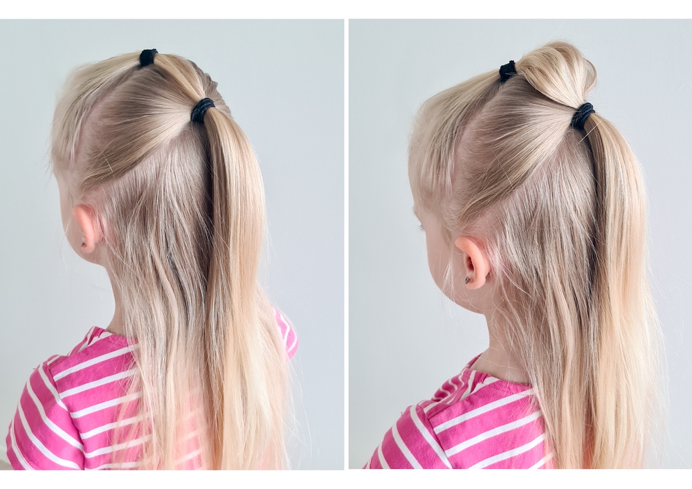 Tee hiusten etuosasta ensimmäinen ponnari. Siistimmän lopputuloksen saat, jos teet vaakasuoran jakauksen hiuksiin korvasta korvaan päälaen kautta (kts. lisäkuva).