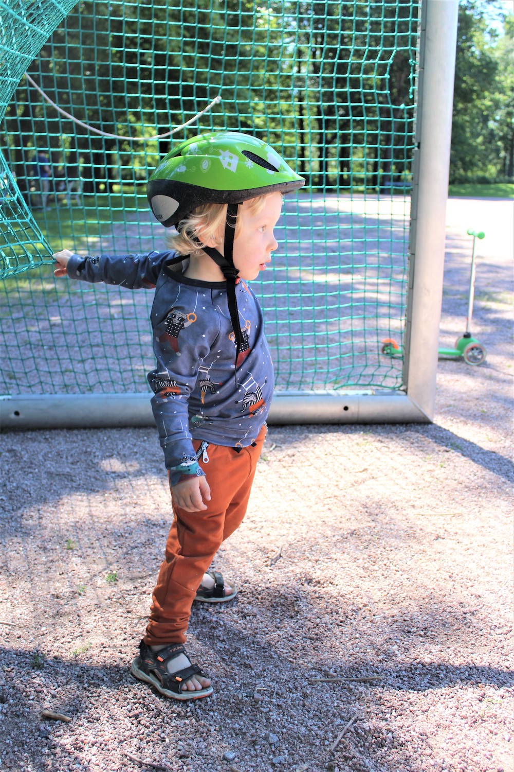 Kotimatkalla pysähdyimme hetkeksi urheilukentälle, ja pääsimme valloittamaan tyhjät jalkapallomaalit. Tämä oli oivallinen lepohetki äidille, joka oli juossut potkulautailevan lapsensa vieressä vatsa täynnä kakkua ja kahvia.