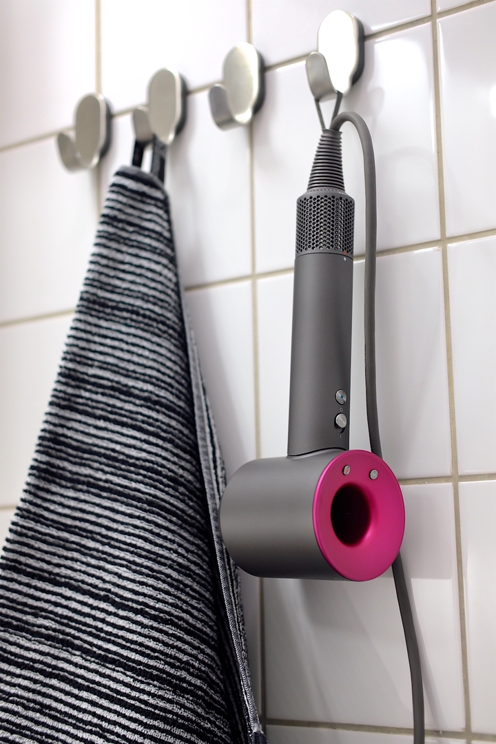 Dysonin selkeä ja aavistuksen futuristinen muotoilu on miellyttänyt silmääni aina. Meillä on kotona kovassa käytössä myös Dysonin varsi-imuri, joka lunasti paikkansa perheessämme heti ensimmäisestä päivästä lähtien. Supersonicin hiilenharmaa väritys on täydellinen omaan makuuni ja pinkki yksityiskohta suuttimessa tuo fööniin kivasti pirtsakkuutta. Kerrankin hiustenkuivaaja jota ei tarvitse sulloa kaapin uumeniin piiloon, vaan sen voi hyvin jättää esille! Supersonicissa on lisäosana pienenpieni lenkki, jonka ansiosta kuivaimen voi ripustaa vaikka kylpyhuoneen naulakkoon, josta sen saa näppärästi käyttöön.