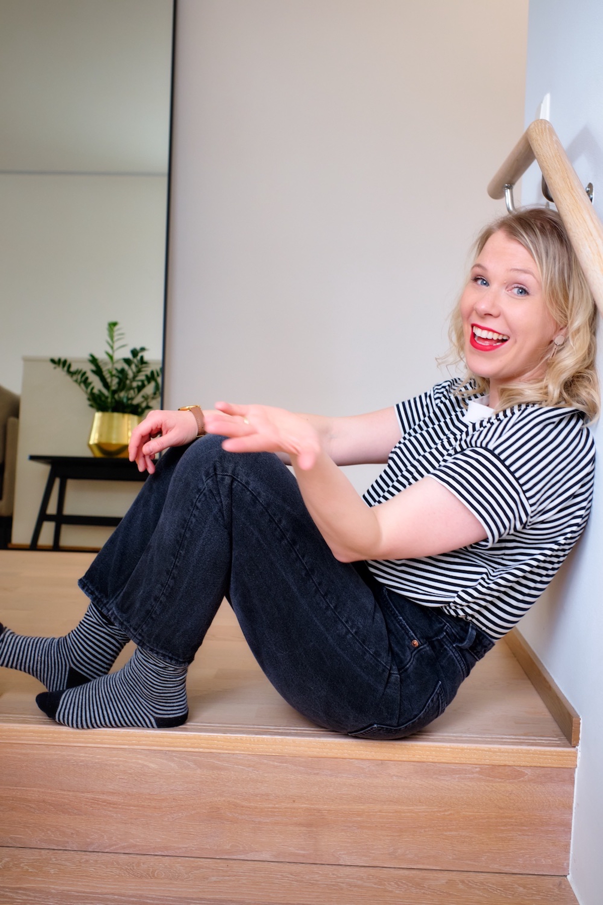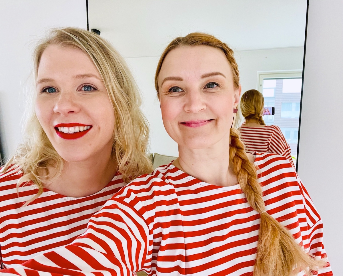 Rakastamme molemmat raitavaatteita, jotka ovat luottovalintoja arjessa. Vaatekaappini täydentyi REA oversize -teepparilla. Mustat raidat saivat kaivamaan myös kirkkaanpunaisen huulipunan esille. En edes muista, milloin olisin laittanut kyseistä punaa viimeksi. Yksin etätöissä ei tule meikattua sen suuremmin.